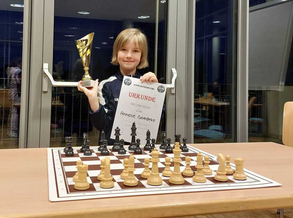 Mit einem Paukenschlag beginnen die OWL-Jugendeinzelmeister-schaften aus Rhedaer Sicht. Annelie Goedeke (9 Jahre) gewinnt mit 4,5 Punkten aus fünf Runden den OWL-Titel in der U10w.