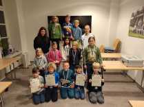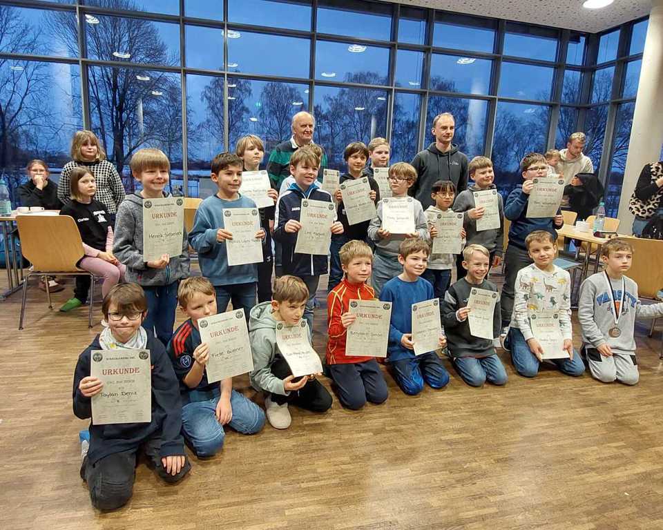 Timo (obere Reihe, Mitte) nutzte heute das Angebot der Schachjugend OWL, ein Einsteigerturnier in Petershagen mitzuspielen. Der weite Weg hat sich dann auch gelohnt. Er konnte drei Spiele gewinnen, und belegte am Ende einen prima achten Platz. Timo lieferte unter anderem dem späteren Gesamtsieger ein spannendes Spiel, in dessen Verlauf ihm ein Remis angeboten wurde. Timo nahm dieses nicht an, und verlor später die Partie. Das zeigt aber seine kämpferische Einstellung. Prima. Gratulation zu einem schönen Auftaktturnier.