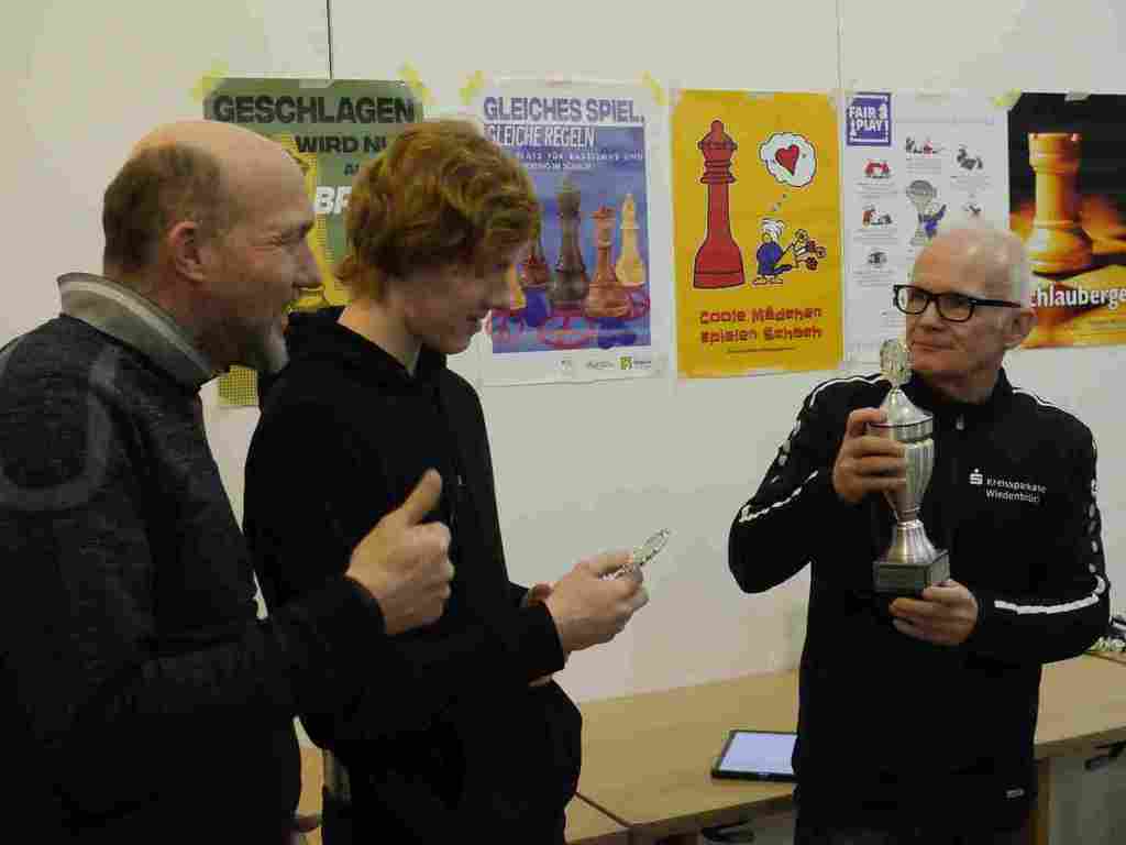 Ausgezeichnet als bestes Team ohne DWZ, das heißt ohne Wertungszahl, war das Team Horstkemper, wo Paul mit seinem Vater zusammenspielte. Auch dieses Team gewann einen Pokal. Dann gab es noch einen