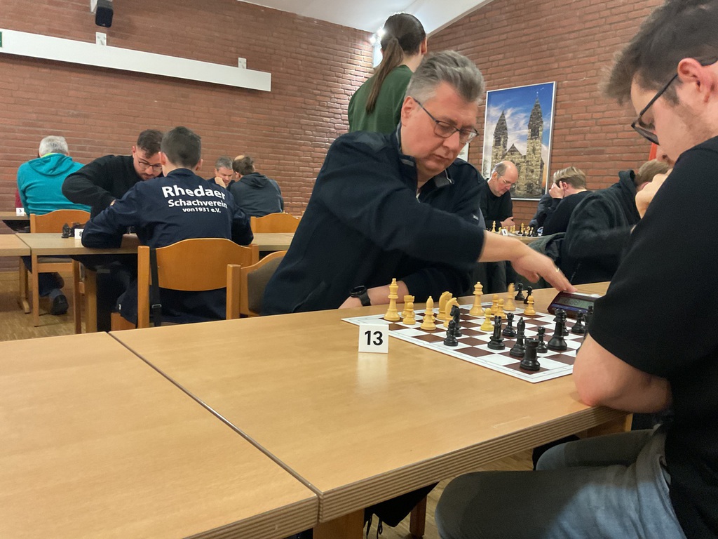 Etwas verrückt war das heutige Spiel gegen Gütersloh schon. Auf beiden Seiten gab es Chancen zu Brettgewinnen. Überwiegend hatten die Gütersloher jedoch ihre Chancen besser genutzt und damit nicht unverdient mit 5:3 gewonnen. Es hätte aber auch noch knapper ausgehen können, auch wäre mindestens ein Mannschaftsunentschieden möglich gewesen. Für die Rhedaer Punkte sorgte Dennis Witherington-Kröger mit einem Angriffssieg. Das sah auch optisch für die Zuschauer sehr schön aus. Auch Andreas Schneider gewann sein Spiel. Er profitierte aber wesentlich von einem Figureneinsteller seines Gegners. Dimitriy Ovetskyy vereinbarte mit seinem Gegenüber ein Remis in einer Stellung, in der sich beide nicht so richtig für eine Attacke entscheiden konnten. Da war das Unentschieden fast schon logisch. Anders sah es beim Spiel von Johann Martens aus. Er hatte zwar am Ende einen Mehrbauern auf der siebten Reihe in einem Turm- und Figurenendspiel. Da aber sein Läufer nicht das Umwandlungsfeld beherrschen konnte, nutzte der Randfreibauer nicht viel. Allerdings hatte Johann wohl während des Spiels eine erfolgsversprechende Möglichkeit ausgelassen. Detlef Kreienberg hatte nach Aufgabe als erster Feierabend. Auch Julian Grusdas verlor sein Spiel. Das war trotzdem sehenswert. Julian griff auf breiter Front an, was aber auch jede Menge Platz für den Gegner gibt, wenn dieser die Angriffslinie überwinden kann. Das passierte leider. Somit bleibt Rheda III leider im Abstiegskampf. Wir freuen uns schon auf das nächste Spiel, das Derby gegen die in diesem Jahr sehr starken Wiedenbrücker.