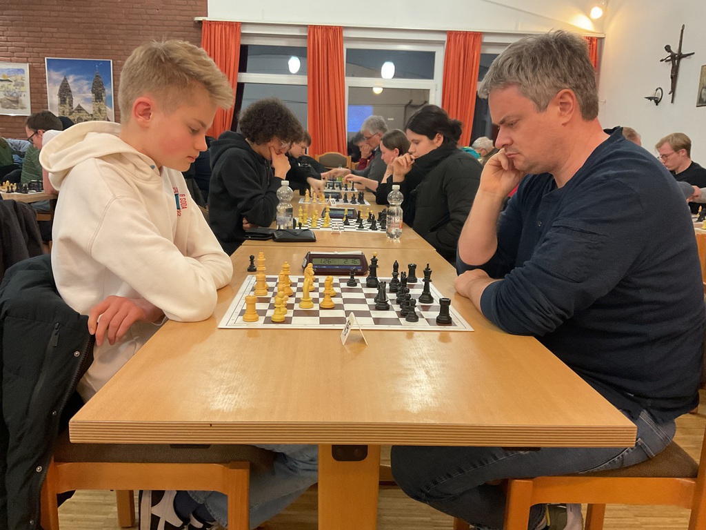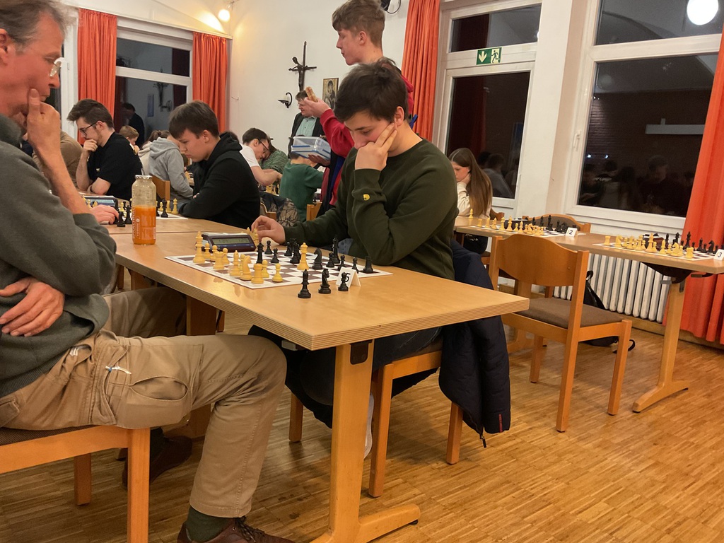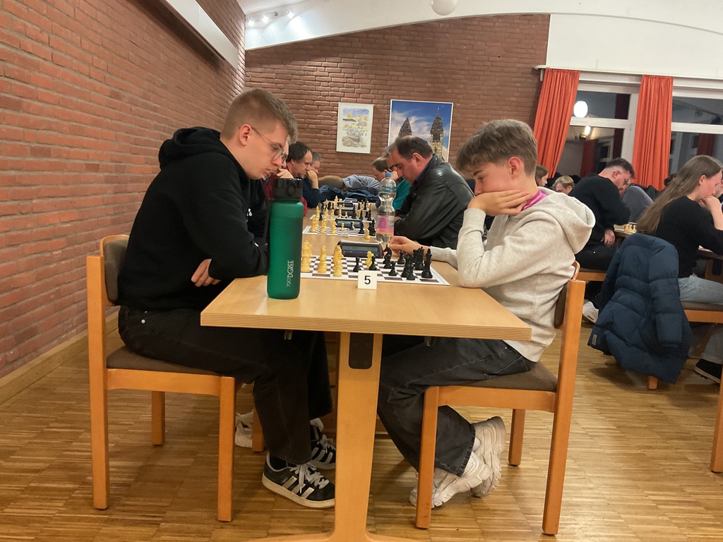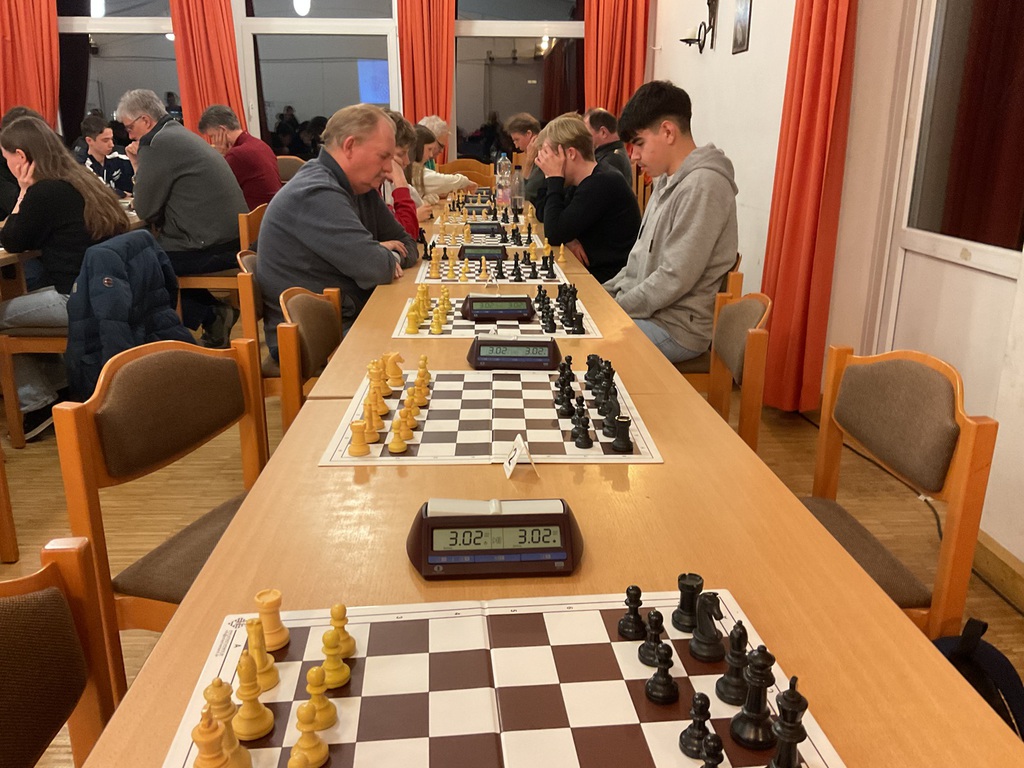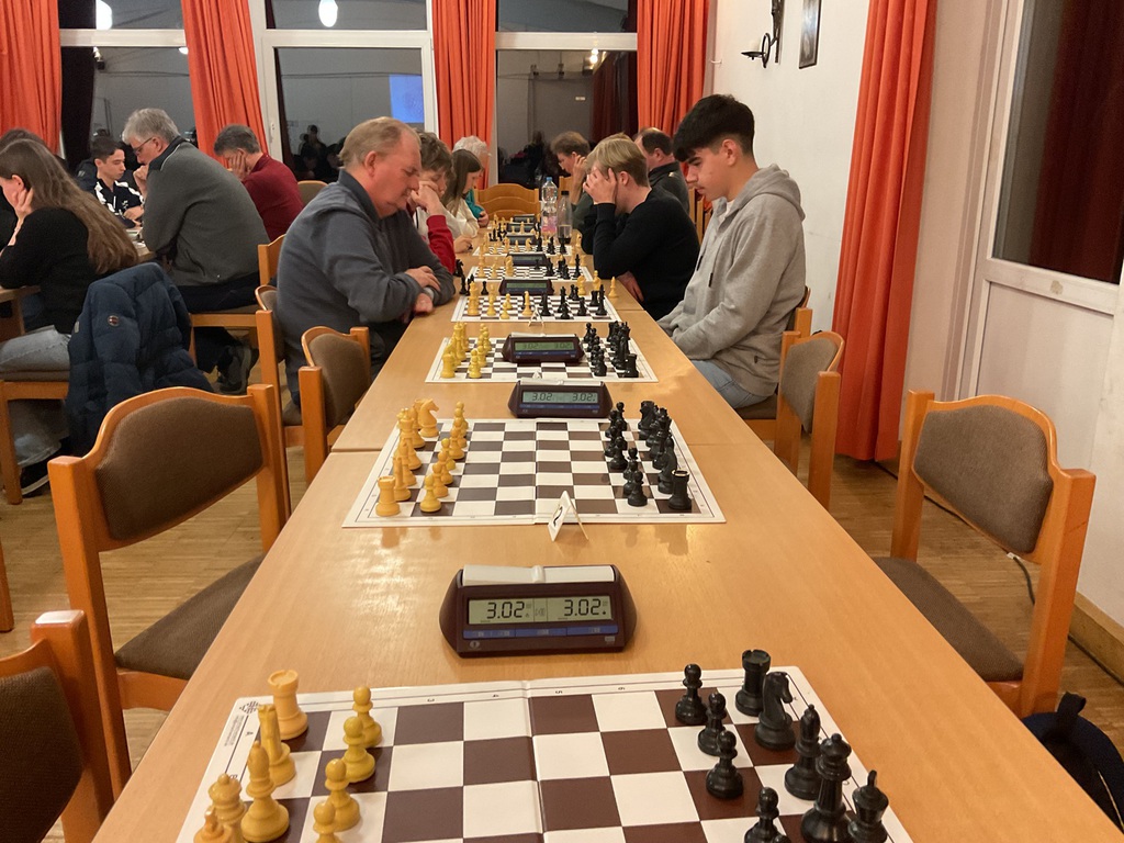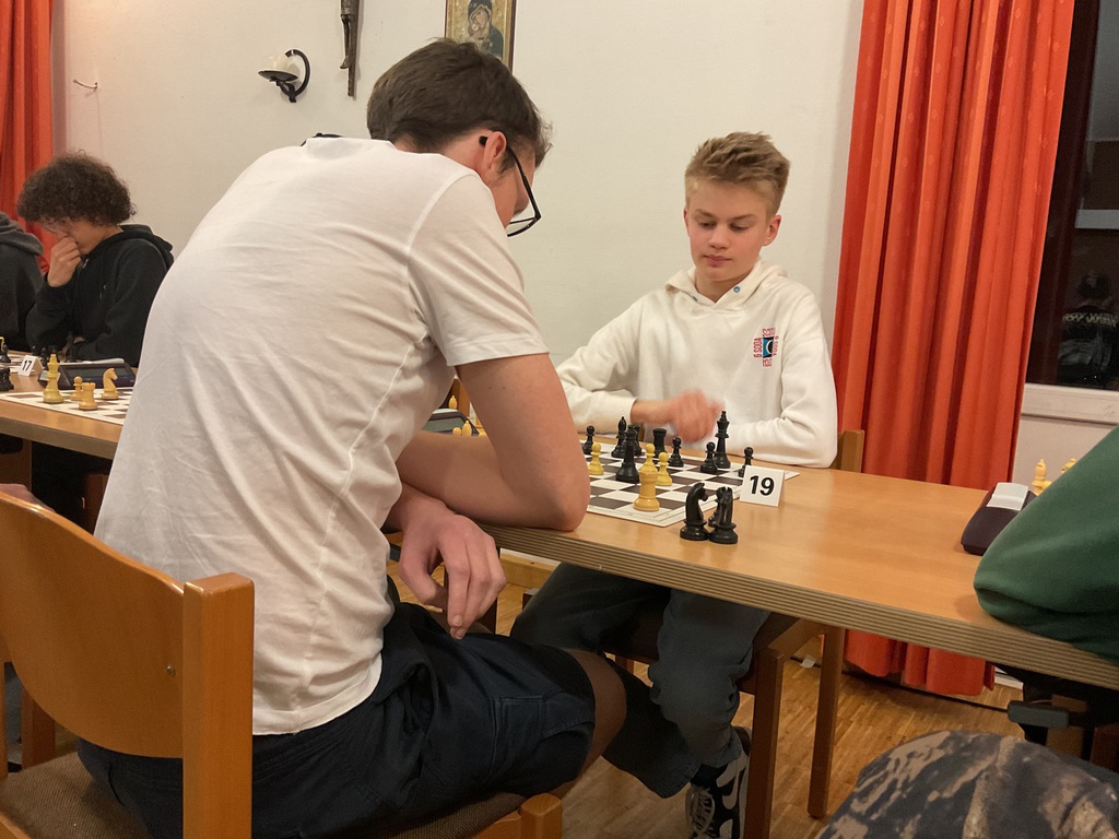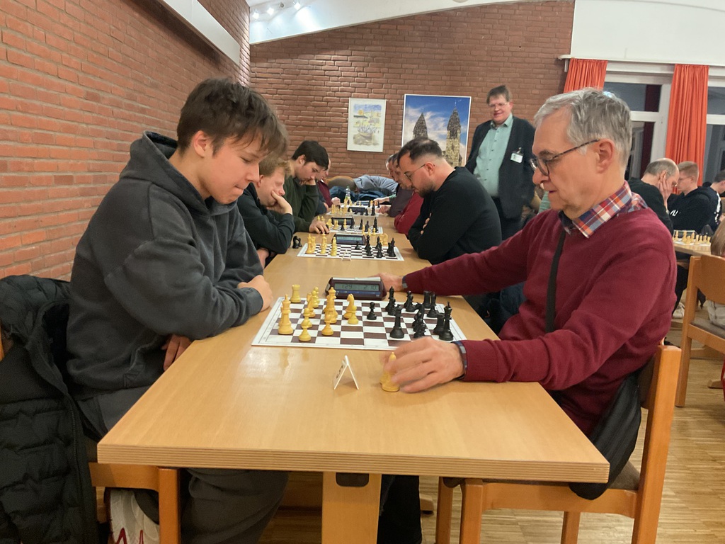 Weil das Liemer Gemeindehaus eine geschlossene Geburtstagsgesellschaft beherbergte, wurden wir kurzerhand in die angrenzende „Wunderbar“ gebeten, die ihrem Namen alle Ehre machte. Zwischen allerlei Werkzeug, Tischtennisplatten und Pappmasché fand sich noch Platz für vier von einem gewaltigen Heizstrahler flankierte Schachbretter. In der Liemer Bastelstube entwickelte sich daraufhin ein lange Zeit enges Match, in dem Luis Wittreck vorzeitig die beruhigende Führung besorgt hatte. Im Mittelspiel bot ihm sein junger Kontrahent eine spielentscheidende Taktik an, die unser Jugendsprecher sich dann auch nicht entgehen ließ. Parallel hatte Timon Liam Weiner bereits nach fünf Zügen einen Zentralbauern gewonnen. Der Weiße erspielte sich anschließend zwar ein wenig Kompensation, doch der beherzte Einsatz seines Freibauern verhalf Timon am Ende noch zu einem sicheren Sieg. Der Gegner von Alexander Döding hatte am letzten Spieltag bereits mit einem Überraschungserfolg aufhorchen lassen und präsentierte sich auch diesmal in starker Verfassung. Der Schwarze hielt die Partie stets im Gleichgewicht, sodass unser Spitzenbrett schließlich im Läuferendspiel das Remis zum Mannschaftssieg mitnahm. Nach hinten raus wurde es dann noch deutlich, weil Florian Schröder das lange stabile schwarze Gegenspiel taktisch überrumpelte und damit erfolgreich den Schlusspunkt zum 3,5:0,5-Erfolg setzte.
