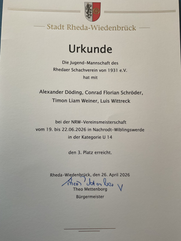 Nach nur zwanzig Minuten hatte Sebastian Monkenbusch die Rhedaer in Führung gebracht. Im Duell der beiden Mannschaftsführer nahm Gisbert Koch das Remisangebot seines Gegenübers im Endspiel Läufer gegen Springer an. Daraufhin folgten drei Rhedaer Siege: Judith Bünte, Oskar Merle und Andreas Bünte machten den Mannschaftserfolg frühzeitig klar. Daneil Ewerszumrode und Matthias Bergmann hielten ihre Partien bis zum Schluss unentschieden. Zuletzt gewann Kirsten Bünte in der längsten Partie des Tages am Spitzenbrett. Sie holte damit ihren 100. Mannschaftspunkt im 154. Spiel für den Rhedaer Schachverein. Damit ist Kirsten erst die zwölfte, die das in den bisher bekannten Überlieferungen des Vereins geschafft hat. Gratulation.