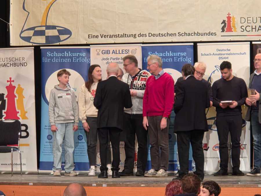 In der C-Gruppe spielten Kirsten Bünte und Alexander Döding mit. Ihre Setzlistenpositionen waren die 13 und 14. Kirsten spielte ein Turnier aus einem Guss. Vier Siege in vier Runden brachten sie vor der Schlussrunde auf Platz 1. In der fünften Runde kam es zu einem echten Finale. Sie musste gegen ihren direkten Verfolger antreten. Dabei würde ihr zum Turniersieg bereits ein Unentschieden reichen. Genau das erzielte sie auch. Damit konnte sie sich über den ersten Platz in der Gruppe freuen, verbunden mit Pokal, Preis und Urkunde. Auch Alexander spielte stark. Er gewann sein Spiel heute und belegte mit 3,5 Punkten Platz 8. Das war bitter, denn der siebte Platz hätte ihm - wie Kirsten - direkt im ersten Qualifikationsturnier einen Platz im Finale der Deutschen Schachamateurmannschaft im Frühjahr 2026 verschafft. Ihm fehlte am Ende ein halber Punkt in der zweiten Feinwertung. Aber sein Sieg sollte noch sehr wichtig werden. Dazu im weiteren Verlauf des Berichts mehr.