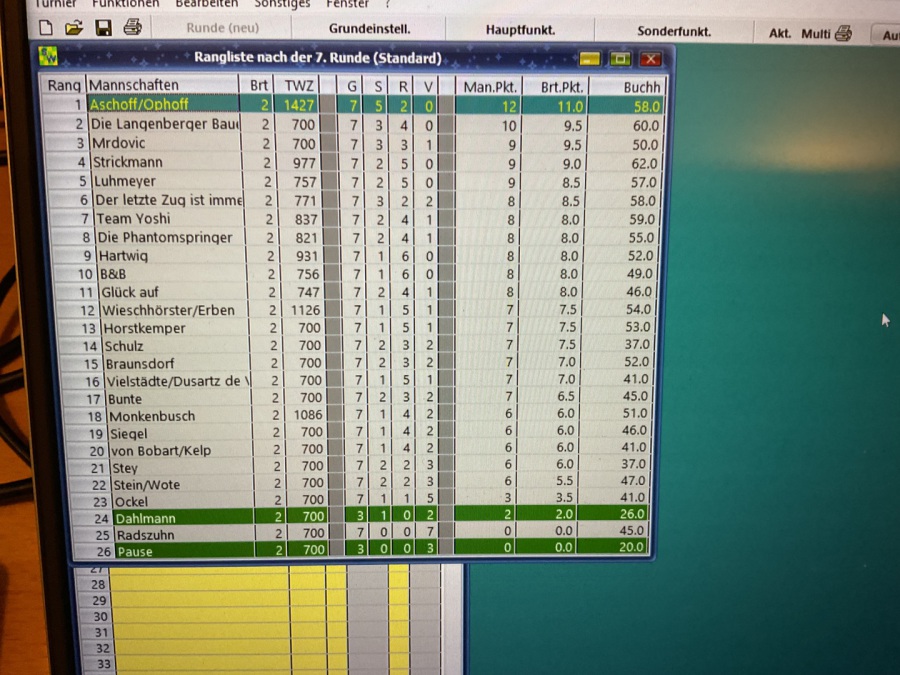 In der Tabelle liegt unsere Mannschaft jetzt am Ende einer Gruppe von fünf Mannschaften, die jeweils sieben Mannschaftspunkte haben. Dicht gefolgt vom nächsten Gegner, den Blauen Springern aus